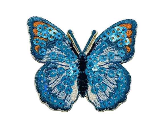 Butterfly sequin embroidered patch designs are constructed by first creating embroidered thread foundation establishing butterfly shape and details, then hand or machine sewing sequins onto embroidered base throughout sparkle overlay. The combination provides structural support from embroidery and decorative shine from sequins creating durable yet glamorous patches.