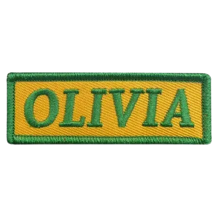 Standard green and yellow Olivia name patches typically measure 2.5 to 3.5 inches wide by 1 to 1.5 inches tall, providing good visibility on shirts and items while maintaining proportional appearance. Size can be customized based on application, with smaller patches for clothing (2 to 3 inches) and larger patches for luggage and bags (4 to 6 inches wide) ensuring appropriate identification throughout various uses.