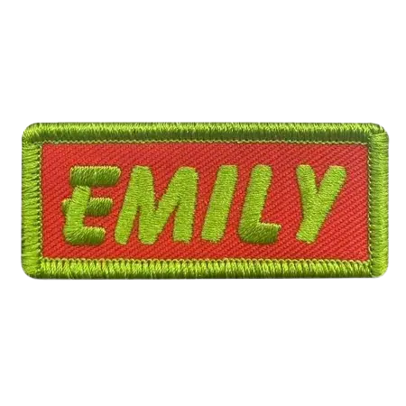 Standard lime green and red Emily name patches typically measure 3 to 4 inches wide by 1 to 1.5 inches tall, providing good visibility on jackets and bags while maintaining proportional appearance. Size can be customized based on application, with smaller patches for clothing (2 to 3 inches) and larger patches for luggage and backpacks (4 to 6 inches wide) ensuring appropriate identification throughout various uses.