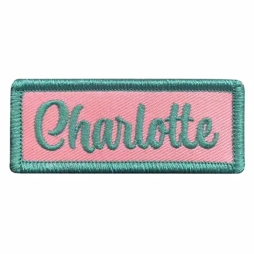Standard teal and pink Charlotte name patches typically measure 3 to 4 inches wide by 1 to 1.5 inches tall, providing good visibility while fitting comfortably on most children's and adult clothing. Size can be customized based on garment type, with smaller patches for infant/toddler clothing (2 to 3 inches) and larger patches for jackets and bags (4 to 5 inches wide).