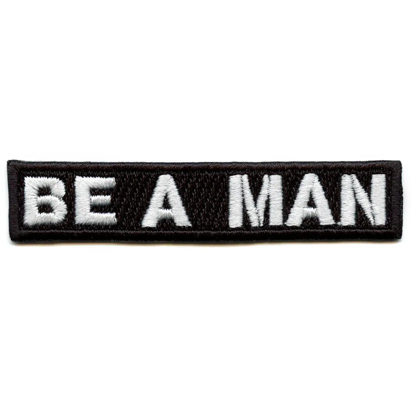 Be A Man Logo Embroidered Iron On Patch is a straightforward and impactful accessory, perfect for those who appreciate direct communication and traditional values. This distinctive, collectible patch features the phrase "BE A MAN" in clear white embroidery, set against a solid black background with a clean white border. Meticulously crafted through precise embroidery, this patch is ideal for personalizing jackets, bags, hats, or a statement jersey patch, making it an excellent way to add a clear and visible message to your belongings. We specialize in creating durable and visually appealing patches, and this Be A Man Logo Embroidered Iron On Patch design is a testament to quality craftsmanship. Our patches are made for longevity and clear display, ensuring your accessories convey your message effectively.