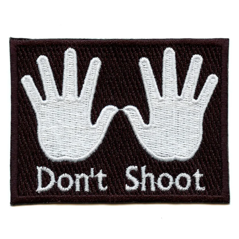 A: The patch features two white hands in a "hands up" gesture with the words "Don't Shoot" below them, on a dark background.