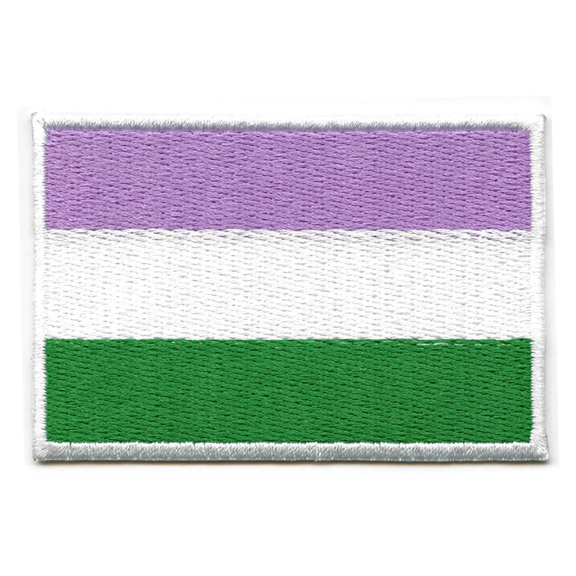 Genderqueer Flag Embroidered Iron On Patch displays the three horizontal stripes of the Genderqueer Pride Flag. The top stripe is lavender, representing androgyny and the queer identity. The middle stripe is white, symbolizing agender identities. The bottom stripe is dark chartreuse green, signifying those outside the gender binary. The entire flag is bordered by a crisp white embroidered outline, giving it a clean and defined edge. This patch serves as a direct and clear declaration of genderqueer pride and community.