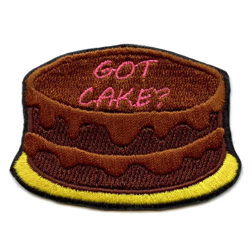 Got Chocolate Cake Patch. This embroidered patch features a delicious looking chocolate cake with frosting layers and the playful question "Got Cake?" in pink lettering. The design captures the rich, comforting essence of a classic dessert. This appealing and detailed patch is an excellent accessory for individuals looking to personalize their apparel, express a love for sweets, or simply add a unique, charming touch to their collection. Easily apply this patch to jackets, bags, or any fabric surface to showcase your passion for confectionery.
