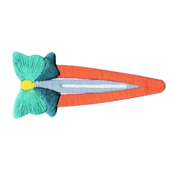 Hair Barrette Clip Embroidered Patch. This eye-catching embroidered patch is shaped like a classic hair barrette or snap clip. The main body of the clip is a vibrant orange, with a light grey or white central line running its length. At one end, a decorative element resembling a butterfly or bow is featured. This design consists of two large, teal-colored, heart-shaped or wing-like sections, flanked by two smaller, darker teal sections, all meeting at a central bright yellow dot. The entire patch is outlined with a thin, light yellow border, giving it a playful and distinct appearance. This Hair Barrette Clip Embroidered Patch is ideal for fashion enthusiasts, crafters, or anyone looking to add a unique, stylized touch to their clothing, bags, or accessories. Crafted by Custom Patches, this high-quality patch is designed for durability and a clear, appealing look.
