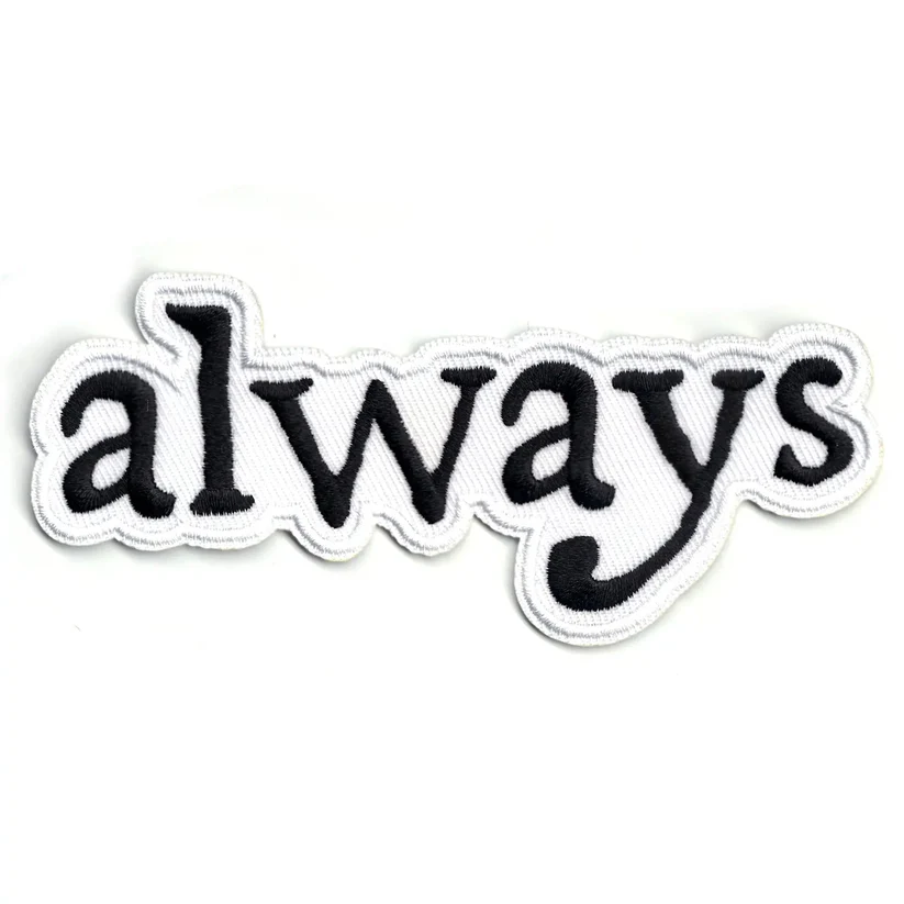 Harry Potter Always Patch features the word "always" in a flowing, script-like font, embroidered in black against a clean white background. The edges of the patch are neatly trimmed with a white border, giving it a crisp, finished look. This iconic word is a profound symbol of unwavering devotion from the Harry Potter series, representing a powerful and enduring theme within the wizarding world.