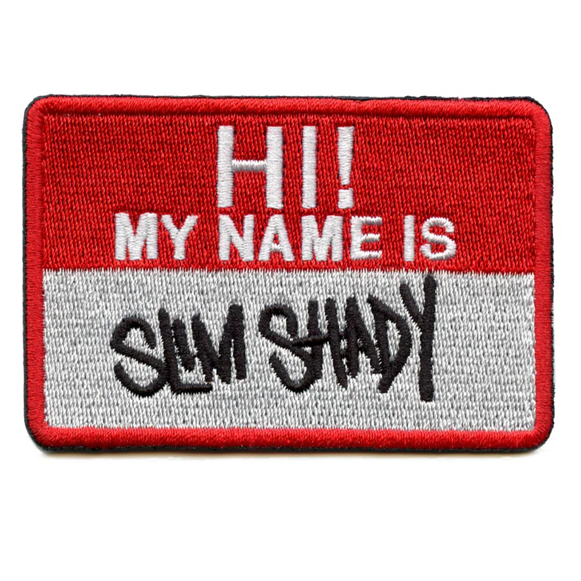 A: The patch is a rectangular nametag design with "HI! MY NAME IS" on a red background and "SLIM SHADY" on a white background.