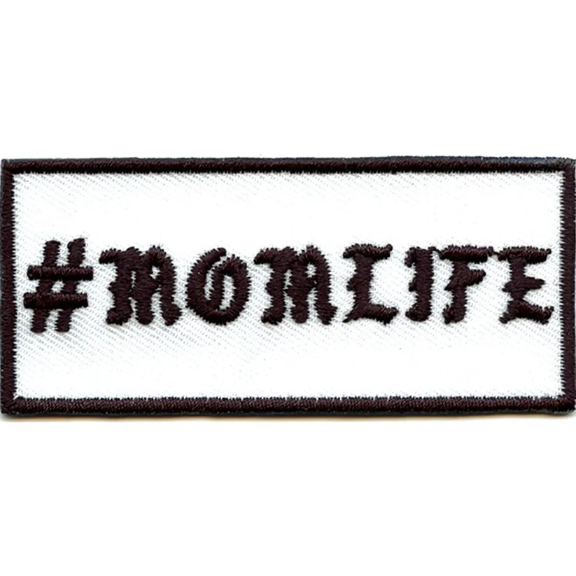 A: The patch is a white rectangle with the black text "#MOMLIFE" in bold embroidery.