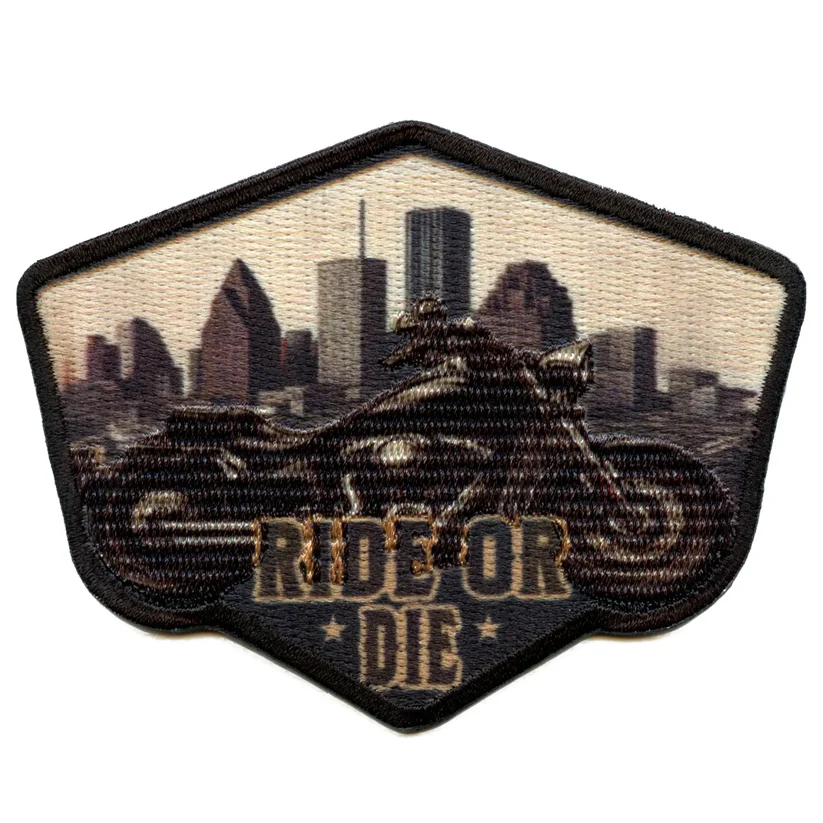 Motorcycle Embroidered Iron-On Patch depicts a classic, dark-toned motorcycle silhouetted against a subdued, sepia-toned city skyline at dusk. The foreground features the bold, distressed-looking text "RIDE OR DIE" in two lines, with "RIDE OR" on the top line and "DIE" below it, flanked by small stars. The patch itself is shaped like a hexagonal shield, adding to its rugged appeal. This patch is a direct statement of dedication to the motorcycle lifestyle and an emblem of enduring loyalty.