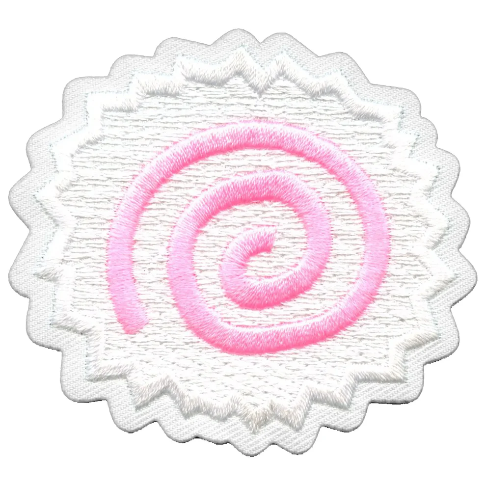 Our Narutomaki Naruto Pink Fish Cake Patch is an oval shaped patch with a distinctive scalloped edge. The main body of the patch is white, providing a clean background for the central design. A prominent pink spiral, starting from the center and widening outwards, is embroidered onto the white surface. A subtle gray outline borders the entire patch, giving it a neat and finished appearance. The detailed embroidery brings this delightful ramen topping to life.