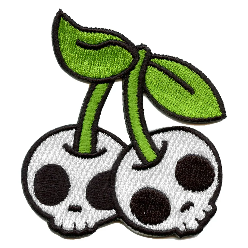 Our Skull Cherries Embroidered Patch is an irregularly shaped patch featuring two cherries with a twist. Each "cherry" is a white skull, with prominent black embroidered eye sockets and a nose cavity, creating a striking contrast. Green embroidered stems connect the two skull cherries, and two vibrant green leaves extend from the top of one stem. A thin black embroidered outline borders the entire patch, giving it a neat and finished appearance. The detailed embroidery brings this unique and striking design to life.