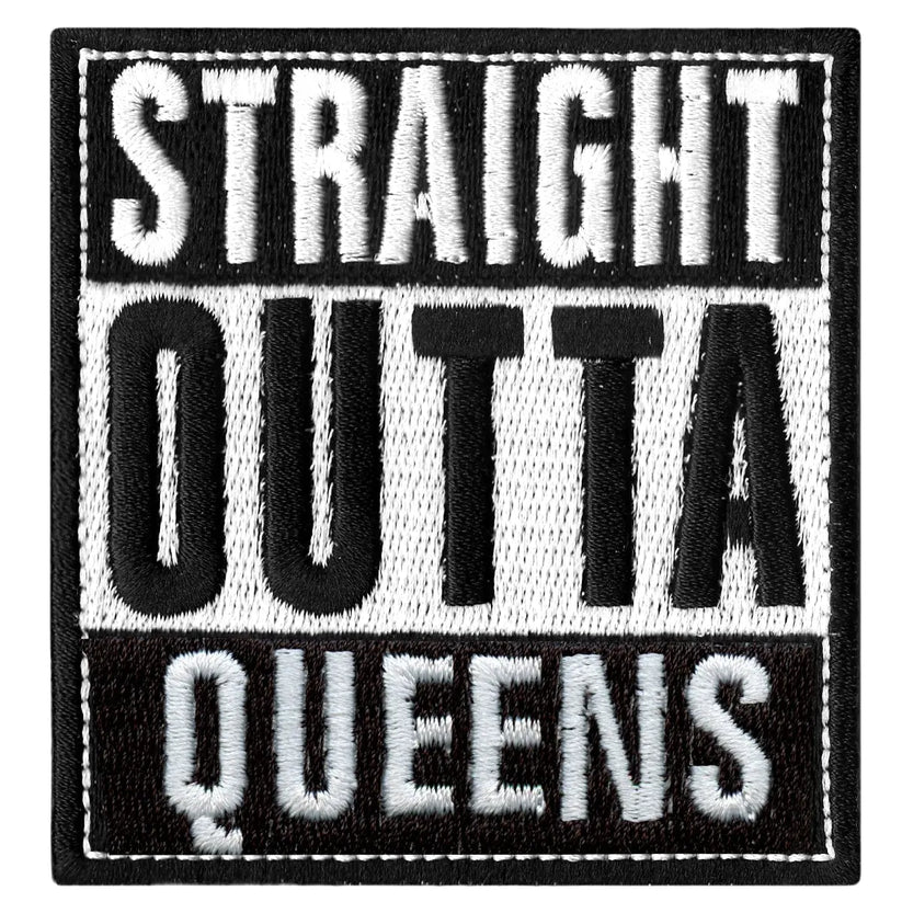 A: The patch features the words "STRAIGHT OUTTA QUEENS" in a bold, layered text design.